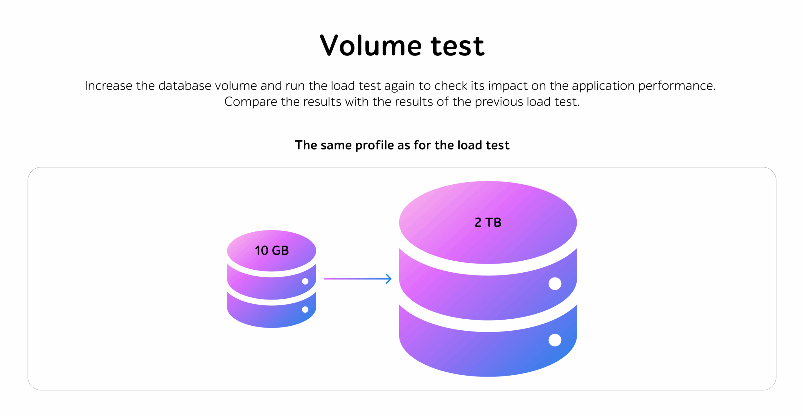 - Volume test is used to evaluate the system performance under increased data in the DB. To conduct volume testing, one should fill in the database with the necessary amount of information.