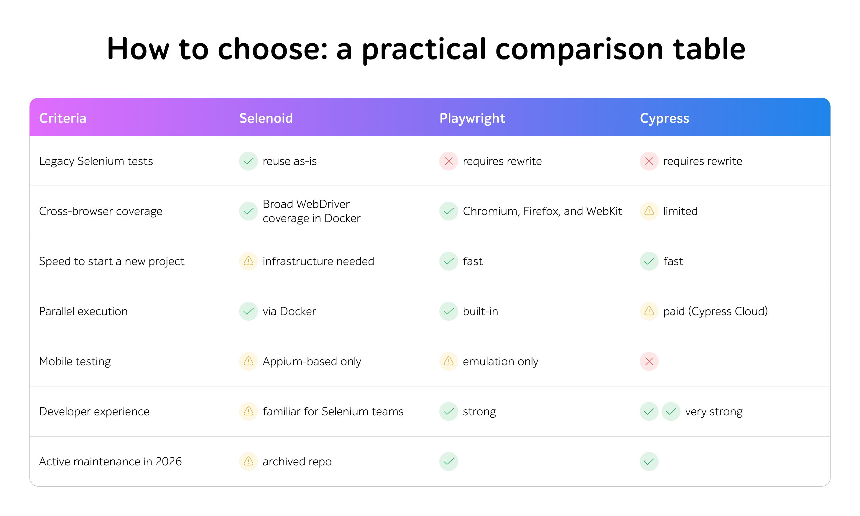 This article is a decision guide. It shows when Selenium Grid or Selenoid still makes sense, when Playwright is the stronger option, and when Cypress fits best.
